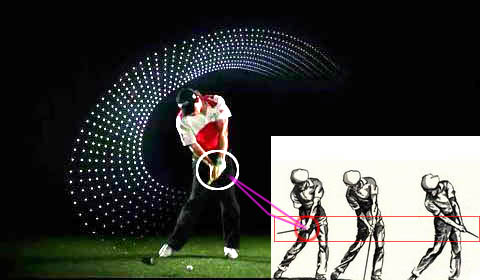 天下所有高尔夫好手在下杆到击球点的时候,握杆的手腕骨一定是往目标突起,比手的其他部位都要超前;球技差的人正好相反,手腕骨内缩,手掌部分比较靠近目标,手掌心朝向地面。[解读:通常说的手腕过多主要是指左手腕骨内缩的错误动作,左手腕骨内缩的球友下杆击球所划出来的弧形几乎跟上杆所划出来的弧形一样,这是极大的错误。下杆击球的挥杆面是跟上杆的挥杆面不同的。如下图中的大图才是正确的击球瞬间双手位置。]